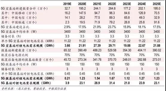數(shù)據(jù):4G基站改5G功率大增,需同步增加備用電池容量,一般備用電源需儲(chǔ)備3-4小時(shí)電量。據(jù)測(cè)算2019-2025年期間5G建設(shè)將帶來155.4GWh的鋰電池需求增量。