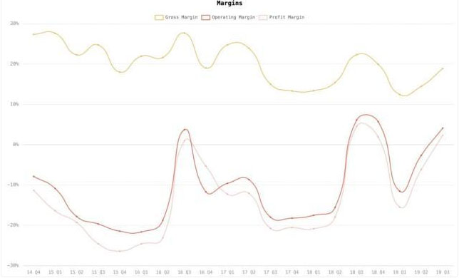 特斯拉2014年Q4至2019年Q3綜合毛利率、營(yíng)業(yè)利潤(rùn)率 來源:hypercharts