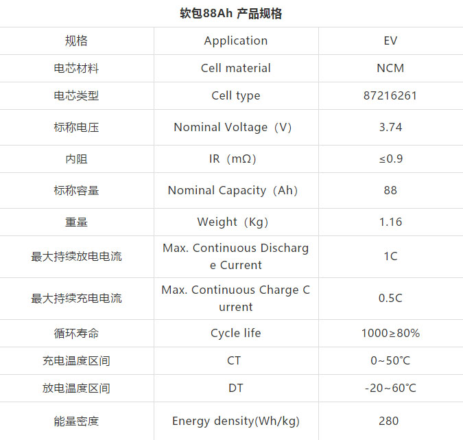 A:88Ah軟包電池是我司最新開(kāi)發(fā)的高能量密度電池產(chǎn)品,單體能量密度達(dá)到280Wh/kg,循環(huán)壽命1000次以上。該產(chǎn)品定位于乘用車市場(chǎng),組裝成電池包后,最高續(xù)航里程可達(dá) 720km以上。該電池具有優(yōu)異的安全性能,可通過(guò)1C6.3V過(guò)充,熱沖擊150度30min、短路、電池荷電95% SOC時(shí)可通過(guò)針刺等國(guó)標(biāo)安全測(cè)試。