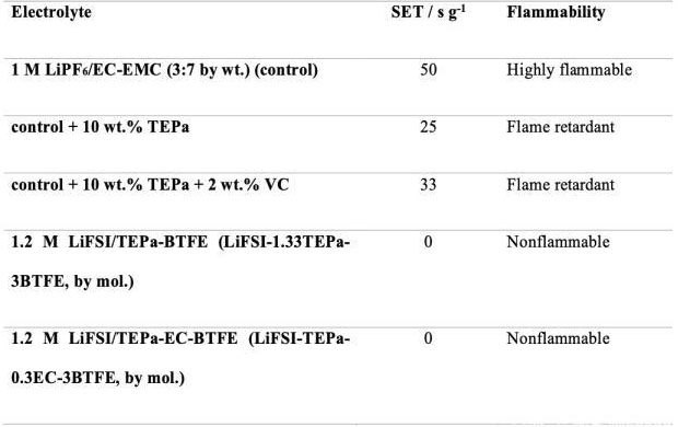 下表為上述的幾種電解液的燃燒自熄滅時(shí)間的一個(gè)對(duì)比,自熄滅時(shí)間越短則意味著電解液的阻燃效果越好,我們可以看到在傳統(tǒng)的電解液中加入阻燃添加劑TEPa后電解液的自熄滅時(shí)間從50降低到了25,表明阻燃添加劑能夠有效的改善電解液的阻燃特性,而兩款高濃度電解液的自熄滅時(shí)間都為0,意味著這兩款高濃度電解液根本就無(wú)法點(diǎn)燃,因此這兩款電解液是完全不燃燒的。
