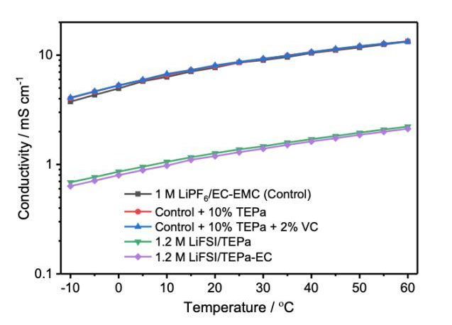 我們知道通常高濃度電解液存在粘度高、電導(dǎo)率低等問(wèn)題,因此作者也測(cè)試了上述幾種電解液在-10到60℃范圍內(nèi)的電導(dǎo)率(如下圖所示),從圖中能夠看到兩款高濃度電解液在常溫下的電導(dǎo)率要顯著低于常規(guī)的碳酸酯類電解液,我們以30℃下的電導(dǎo)率為例,高濃度電解液的電導(dǎo)率為1.4mS/cm,而碳酸酯類電解液的電導(dǎo)率可以達(dá)到8.6mS/cm,遠(yuǎn)高于高濃度電解液。