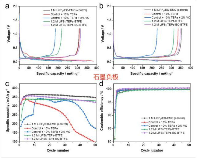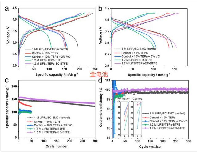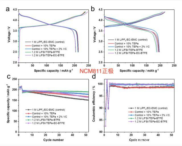 實(shí)驗(yàn)中作者采用的電池正極材料為NCM811,負(fù)極材料為石墨,實(shí)驗(yàn)中采用的幾種電解液分別為:1)傳統(tǒng)的碳酸酯類電解液(EC/EMC=3:7,1M LiPF6);2)傳統(tǒng)碳酸酯類電解液加入10wt%的TEPa;3)在傳統(tǒng)碳酸酯類電解液中加入10wt%的TEPa和2wt%的VC;4)LiFSI:TEPa:BTFE分別為1:1.3:3的高濃度電解液;4)LiFSI:TEPa:EC:BTFE分別為1:1:0.3:3的高濃度電解液。