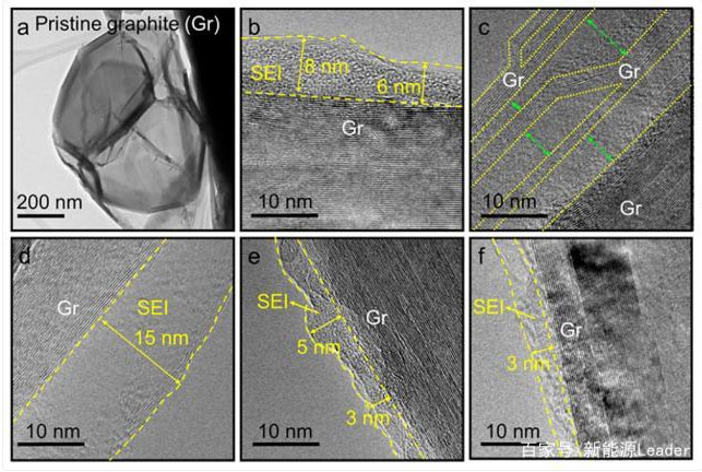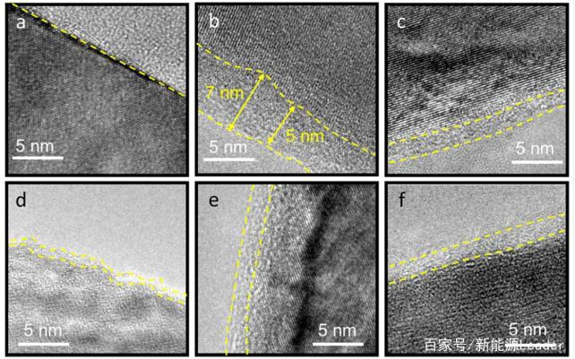 為了分析高濃度電解液對(duì)電池壽命影響的原因,作者采用高分辨率的TEM對(duì)電極的表面進(jìn)行了分析,從下圖a可以看到原始的石墨顆粒表面非常干凈,在經(jīng)過(guò)50次循環(huán)后由于LiPF6和EC的分解,負(fù)極表面形成了一層厚度6-8nm的SEI膜(如下圖b),但是如果我們?cè)谏鲜龅奶妓狨ヮ愲娊庖褐屑尤隩EPa阻燃劑后負(fù)極表面未形成明顯的SEI膜(如下圖c所示),但是我們能夠看到明顯的石墨層剝離的現(xiàn)象,如果在加入阻燃添加劑的同時(shí)再想電解液中加入VC添加劑,我們則能夠在負(fù)極表面觀察到一層厚度為15nm厚的SEI膜(下圖d),較厚的SEI膜成功的抑制了石墨層的剝離,但是較厚的SEI膜也使得電池的極化顯著增加。從下圖e可以看到采用高濃度電解液的負(fù)極表面形成的SEI膜要明顯更薄,如果在高濃度電解液中進(jìn)一步加入EC后我們能夠在石墨負(fù)極表面形成一層厚度僅為3nm的均勻SEI膜。