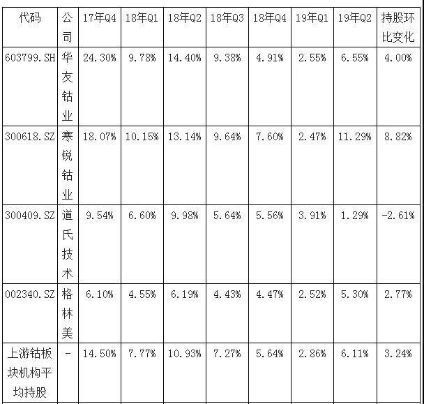 上游鋰鈷板塊,四大鈷企業(yè)公募基金十大重倉(cāng)股平均持倉(cāng)由18年4季度的5.6%降至1季度的2.9%,2季度增至6.1%,而四大鋰企業(yè)由1季度的1.9%增至3.4%。