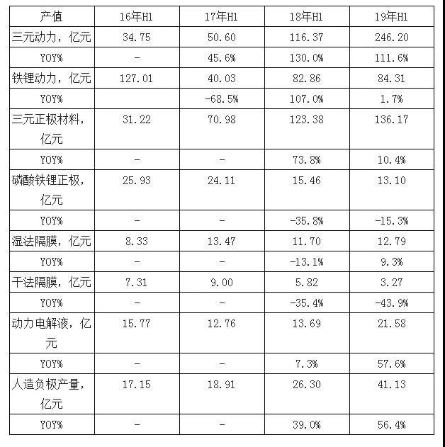 一、2019年H1各板塊產(chǎn)值:三元?jiǎng)恿﹄姵?、人造?fù)極、電解液漲幅居前