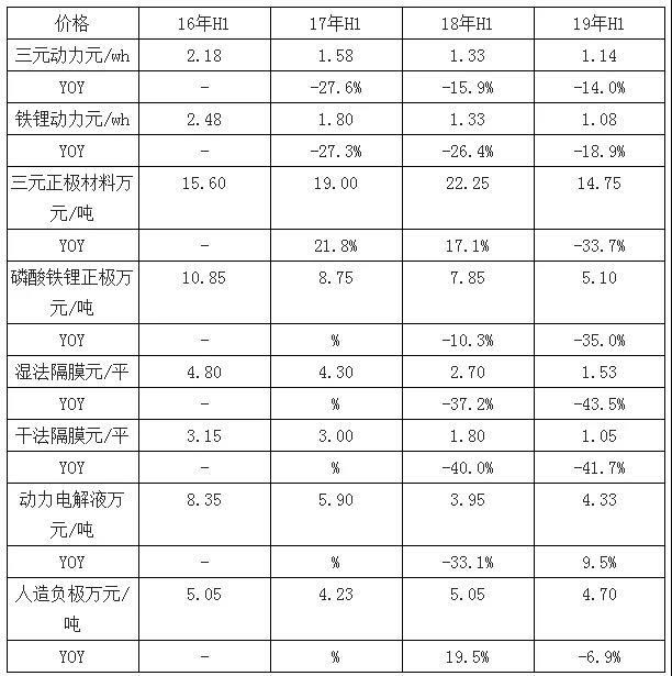 根據(jù)相關(guān)數(shù)據(jù),19年上半年除電解液外,價(jià)格均有下降;電解液上半年價(jià)格平均為4.33萬(wàn)元/噸,同比增長(zhǎng)9.5%,電解液漲價(jià)主要是因?yàn)樵牧螮C價(jià)格大幅上漲所致。