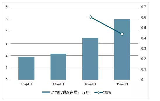 16H1-19H1動(dòng)力電解液產(chǎn)量及增長(zhǎng)