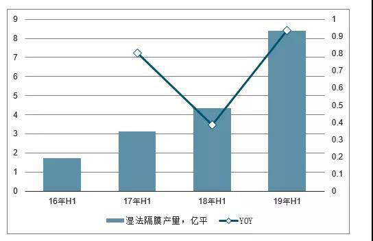 16H1-19H1濕法隔膜產(chǎn)量及增長(zhǎng)
