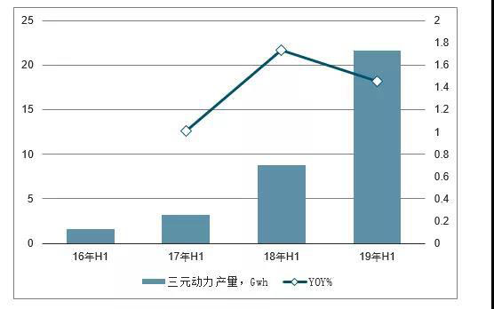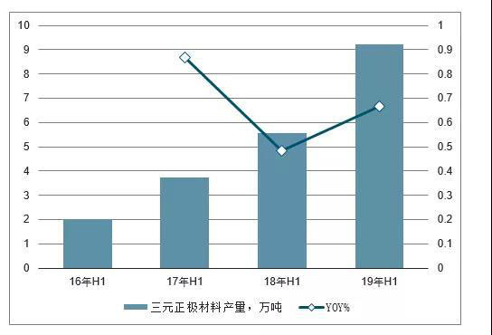 16H1-19H1三元正極材料產(chǎn)量及增長(zhǎng)