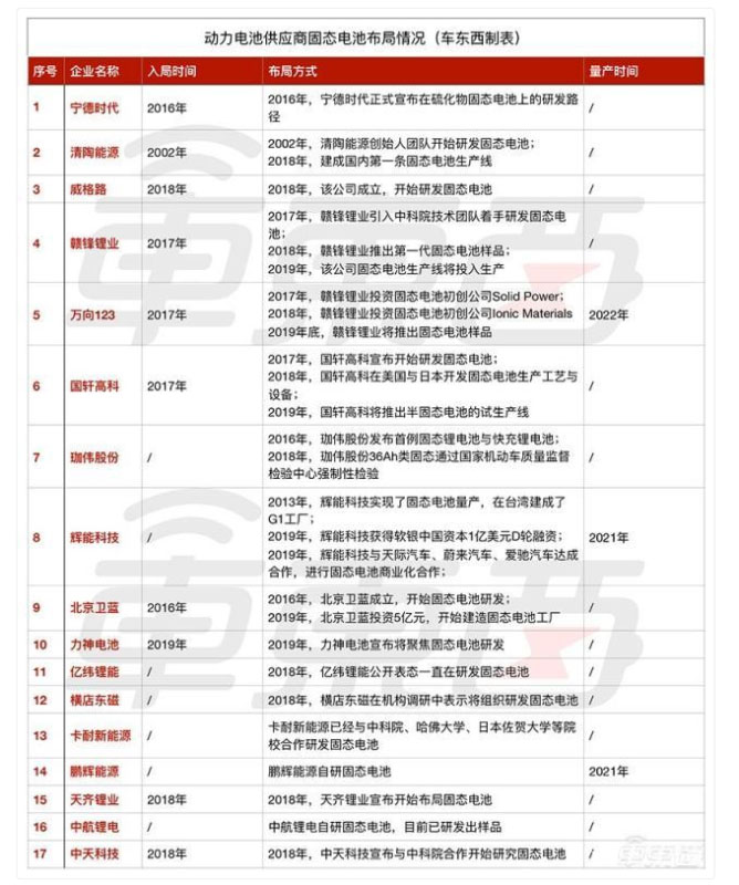雖然國(guó)內(nèi)整車(chē)廠入局固態(tài)動(dòng)力電池市場(chǎng)的玩家較少,不過(guò)在動(dòng)力電池產(chǎn)業(yè)鏈內(nèi),固態(tài)電池已經(jīng)成為了兵家必爭(zhēng)之地。據(jù)了解,目前國(guó)內(nèi)包括寧德時(shí)代、比亞迪、贛鋒鋰業(yè)、萬(wàn)向123、輝能科技、力神電池、億緯鋰能在內(nèi)的19家動(dòng)力電池公司已開(kāi)始固態(tài)電池的研發(fā)。