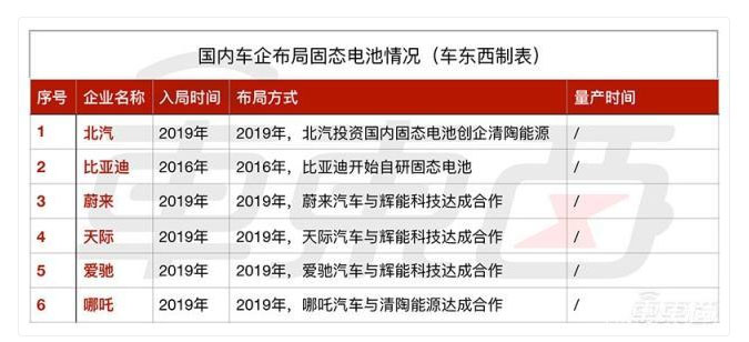 根據(jù)公開(kāi)資料整理,國(guó)內(nèi)傳統(tǒng)車(chē)企僅有北汽集團(tuán)與比亞迪兩家布局固態(tài)電池;新造車(chē)公司對(duì)固態(tài)電池接受度更高,蔚來(lái)汽車(chē)、天際汽車(chē)、愛(ài)馳汽車(chē)分別與臺(tái)灣輝能科技達(dá)成合作,共同研發(fā)動(dòng)力電池;哪吒汽車(chē)也在此前宣布了與清陶能源的合作計(jì)劃,SERES也布局了固態(tài)電池領(lǐng)域。