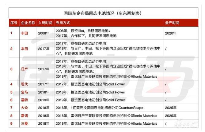 國(guó)際車(chē)企在固態(tài)電池上的研發(fā)起點(diǎn)相對(duì)較早,最早入局的豐田在2008年就與固態(tài)電池創(chuàng)企伊利卡(Ilika)展開(kāi)了合作,并于2012年公布了研發(fā)成果。而在2016年新型固態(tài)電解質(zhì)材料發(fā)現(xiàn)之后,寶馬、本田、日產(chǎn)、現(xiàn)代、大眾等車(chē)企巨頭紛紛宣布開(kāi)始固態(tài)電池研發(fā),并將落地時(shí)間定在了2020年-2030年之間。