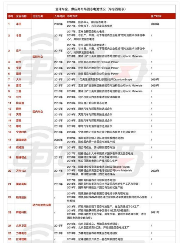 不過(guò),關(guān)注固態(tài)電池的不僅僅只有古迪納夫等學(xué)界的大牛。在汽車(chē)產(chǎn)業(yè),豐田、寶馬、本田、日產(chǎn)、現(xiàn)代、大眾等國(guó)際主流車(chē)企已經(jīng)紛紛開(kāi)始布局固態(tài)電池領(lǐng)域,國(guó)內(nèi)長(zhǎng)城、比亞迪、天際汽車(chē)、蔚來(lái)汽車(chē)、愛(ài)馳汽車(chē)與眾多動(dòng)力電池供應(yīng)商也已入局,并亮出了固態(tài)電池的落地時(shí)間表。