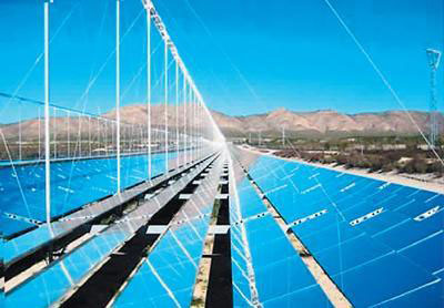 塔式太陽能光熱發(fā)電的原理并不復雜,就是通過多臺跟蹤太陽運動的定日鏡,將太陽輻射反射到置于高塔上的吸熱器,加熱傳導介質(zhì),進而產(chǎn)生蒸汽利用汽輪機發(fā)電機組產(chǎn)生電力。與太陽能光伏發(fā)電相比,太陽能光熱避免了硅晶光電轉(zhuǎn)換工藝,節(jié)省了能源消耗,降低了發(fā)電成本,而且真正做到零排放。