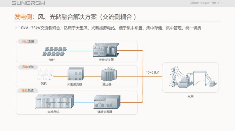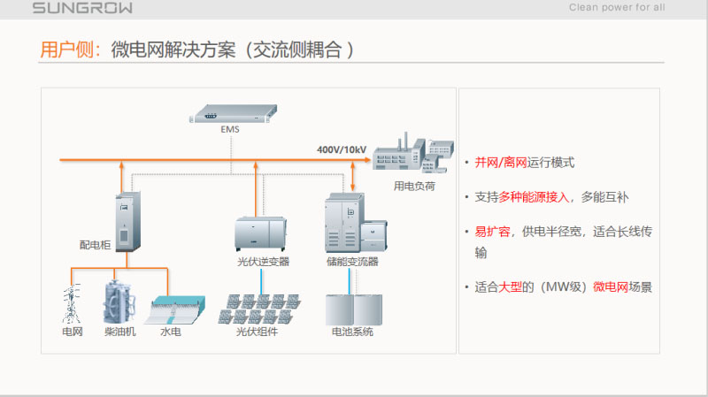 交流、直流耦合的場景,這是微網,上午一位專家也分享了,以前在一些島嶼、供電不穩(wěn)定的地區(qū)有這個需求,以前柴發(fā)是助理電源,柴發(fā)的成本高、環(huán)境污染,第三個特點是供電不穩(wěn)定。加了光伏和儲能以后,可以回避這三個缺點。成本降低、供電穩(wěn)定,同時環(huán)境也得到保護,特別是旅游區(qū)的需求比較大,交流側耦合都是兼容并網和離網模式,也支持多源互補,而且易擴展,適用于大型MW級以上的項目。直流側耦合一般是小型的項目。