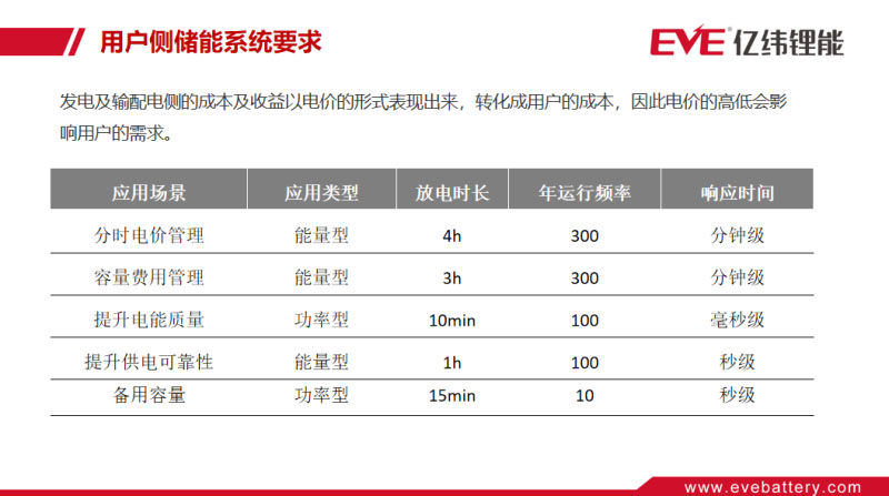 用戶側(cè)場景主要為分時電價管理、容量費用管理、提升電能質(zhì)量、提升供電可靠性。很多制造業(yè)對電力要求比較高,擔心停電,要通過儲能保障用電的可靠性,備用容量、重要負荷的保障。更多為能量型的應(yīng)用。