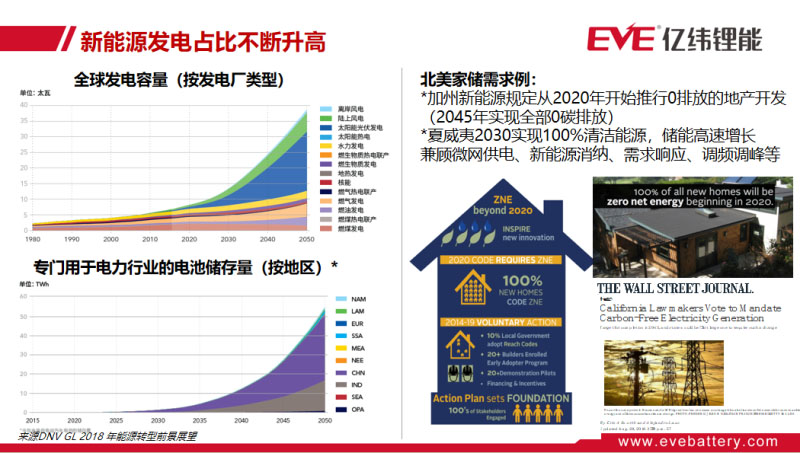 能源電氣化是一個趨勢,新能源在電氣化過程中占比會越來越高,右圖可以看出(見PPT),比如說北美提出了到2020年能源實現(xiàn)零排放,希望在2030年實現(xiàn)百分之百的清潔能源,而且提出新能源要有多重的的價值,如微電網(wǎng)、新能源消納、需求響應(yīng)、調(diào)頻調(diào)峰等。左圖是在DNV做的行業(yè)分析報告(見PPT),報告可以看出,到2050年新能源可能會占到能源結(jié)構(gòu)的60%以上。電池的容量和需求,從圖表上可以看出,目前需求是快速發(fā)展的趨勢,未來在中國需求容量占一半以上。