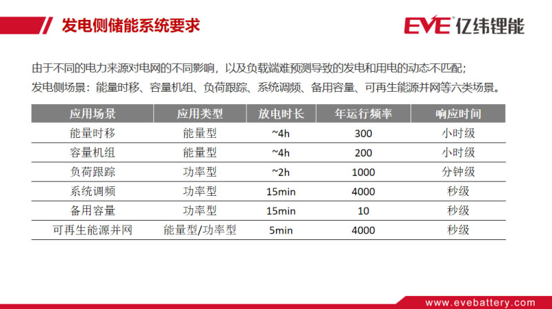 首先看發(fā)電側(cè)應(yīng)用場景技術(shù)要求,能量時移偏向能量型,放電時長4小時,白天發(fā)電多了存起來晚上再進行釋放,響應(yīng)時間是小時級別;負荷跟蹤,光伏發(fā)電進行平衡,按實時的發(fā)電功率進行調(diào)度的響應(yīng)。其他如場景還有調(diào)頻和備用電源等。