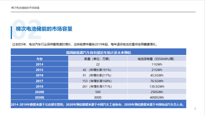 如果說梯次利用,我們先看一下梯次利用的市場容量,這是一個粗放的統(tǒng)計,電動汽車的統(tǒng)計來自于汽車工業(yè)協(xié)會和百人會。我們可以看到從2014年開始到2018年,因為2019年的數(shù)據(jù)還沒有統(tǒng)計出來?;旧想妱悠囆袠I(yè)每年的增長率都接近200%,增長率最低的一年是168%,2017年查騙補。即使是對行業(yè)有沖擊,增長率依然保持在160%以上。電池保有量按照每輛車50度電估計,這個與真實的有些出入,早期以大巴車為主。梯次利用的好處是市場的物料來源基本上不需要預測,只需要看五、六年前的電動汽車數(shù)據(jù)就是非常精準的。因此我們可以得到的結論是,大量的退役電池以每年倍增的模式向市場上堆積。