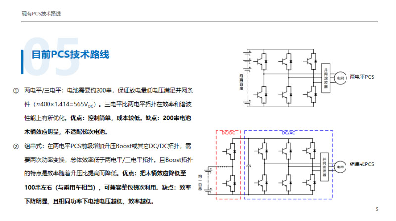 我們再來看一下作為核心設備的PCS目前發(fā)展到什么階段?目前市場上主流的PCS都是兩電平和三電平,三電平分為MPC和TMPC型的,他們的技術瓶頸、電池串聯(lián)數(shù)量比較大,滿足380伏的工業(yè)電網(wǎng)條件,直流測電價高于540伏,這是放電的最低電價,額定電價選擇在650伏,需要200多支的串聯(lián)。當然優(yōu)點是成本比較低、控制比較簡單。第二種方案是很多企業(yè)做的組串式,核心是DC/DC升壓,是一個兩電平,前端是整包利用的梯次電池,串聯(lián)在100串左右,優(yōu)點是木桶效應200支減到100支,雖然沒有根本解決問題,畢竟得到了減緩。另外可以兼容整包的梯次利用,缺點是它經歷了兩次的功率變換,效率通常比較低。儲能和光伏一樣是效率高度敏感型的行業(yè),我們考核儲能的效率是考慮充放電效率,一充一放效率只有94%的話,一充一放的平放只有88%。