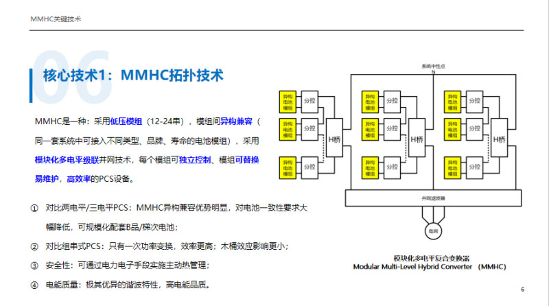清華團隊經過七年的研發(fā),我們提出三個關鍵的核心技術,第一個就是MMHC的拓撲技術,MMHC是采用低壓模組,通常是12到24串,模組間完全異構兼容。采用多電平級聯(lián)并網(wǎng)技術的PCS,可以實現(xiàn)模組的獨立控制、模組間的任意替換,并且保持非常高的效率,基本上在97%以上。同時同一套設備可以兼容不同廠家、不同品牌、不同類型、不同壽命的電池。