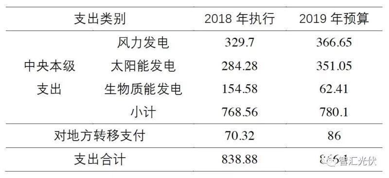 2019年可再生能源電價(jià)附加支出預(yù)算數(shù)為866.1億元,其中:(1)中央本級支出預(yù)算數(shù)為780.1億元,比2018年執(zhí)行數(shù)增加11.54億元,增長1.5%。(2)中央對地方轉(zhuǎn)移支付預(yù)算數(shù)為86億元,比2018年執(zhí)行數(shù)增加15.68億元,增長22.3%。