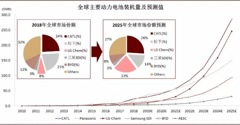 從2017-2018年?duì)I收結(jié)構(gòu)來看,三星側(cè)重消費(fèi)與儲(chǔ)能,LG Chem側(cè)重動(dòng)力及儲(chǔ)能,松下逐步淡出消費(fèi)專注動(dòng)力,CATL則專注動(dòng)力并拓展儲(chǔ)能。展望2025年,我們認(rèn)為動(dòng)力領(lǐng)域CATL與LG Chem有望占優(yōu),2025年市場份額可分別達(dá)26%與22%,消費(fèi)領(lǐng)域三星等繼續(xù)占主導(dǎo)。