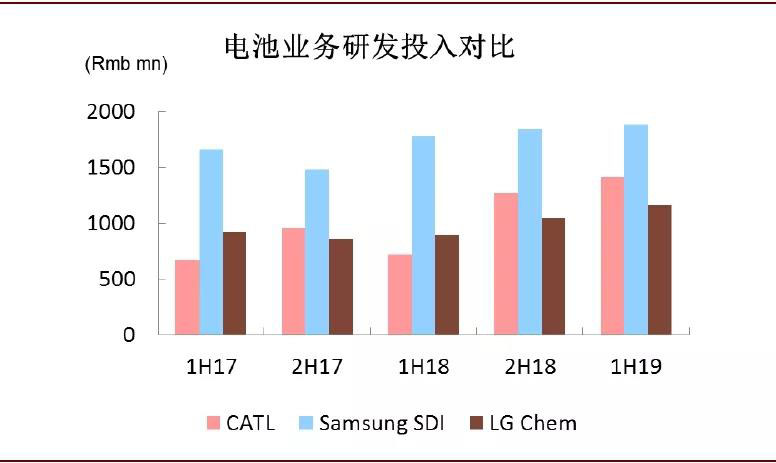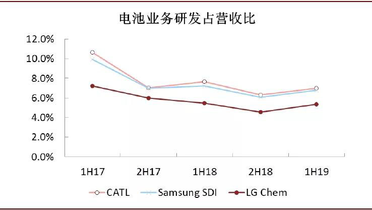 圖表: 電池業(yè)務(wù)研發(fā)投入占營收比重上,CATL高于三星SDI與LG Chem