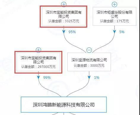 鴻鵬新能源成立于2018年11月,由寶能投資集團(tuán)與寶源物流共同出資建立。其中,寶能集團(tuán)出資29.7億元,占股99%;寶源物流出資3000萬(wàn)元,占股1%。值得一提的是,寶源物流背后實(shí)際控制人同樣為寶能集團(tuán)(占股95%)。