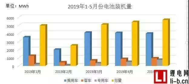 2019年1月份動力電池裝機總量為4977MWh;2月份動力電池裝機總量下降逾一半為2511.1MWh;3月動力電池裝機總量回升與1月裝機總量相近,為5085.5MWh;4月動力電池裝機總量漲幅較小,為5406.1MWh;5月動力電池總裝機量為5668.4MWh,較上個月微增。