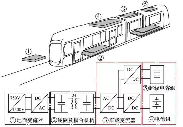 在車載儲(chǔ)能系統(tǒng)中,電池/超級(jí)電容混合儲(chǔ)能系統(tǒng)(Hybrid Energy Storage System, HESS)由于兼具高能量和高功率密度的優(yōu)點(diǎn),引起了人們的關(guān)注。本文考慮混合儲(chǔ)能系統(tǒng)作為無線電能傳輸系統(tǒng)的用電負(fù)載,以有軌電車為例給出了充電拓?fù)洌鐖D1所示。