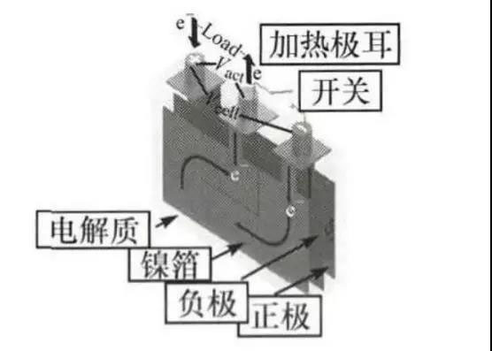 當(dāng)動力電池SOC較低時,放電加熱方法的使用有局限性。在單體動力電池內(nèi)部埋設(shè)鎳箔加熱片,當(dāng)檢測到電池溫度低于0℃時,就會引導(dǎo)電子穿過鎳箔產(chǎn)生熱量加熱電池自身。
