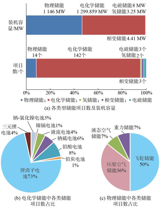 由圖 1(a)可知,兆瓦級儲能調(diào)頻工程中,物理儲能項目數(shù)少、單項容量大,電化學儲能項目數(shù)逾百、單項容量小,氫儲能、相變儲能的調(diào)頻規(guī)模應用則顯稀少。此外,綜合圖 1(a),(b),(c)可知,項目數(shù)最多的電化學儲能中鋰離子電池占據(jù)全部電化學儲能調(diào)頻項目73%,物理儲能裝機容量接近全部兆瓦級調(diào)頻儲能容量50%,以飛輪儲能、壓縮空氣儲能項目數(shù)居多。