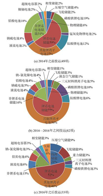 為分析實際調(diào)頻項目中儲能類型結(jié)構變化趨勢,將前述164項工程數(shù)據(jù)按投運時間統(tǒng)計為2014年前、2014年至2016年之間、2016年后三個時期。同時為了解電化學儲能子類結(jié)構,將全部儲能劃分為物理儲能、鋰系電池儲能、非鋰系電池儲能、超級電容器、相變儲能和氫儲能,再進行二級結(jié)構剖分得到圖 2。圖中:其他鋰離子電池指DOE統(tǒng)計資料未給明具體類型的鋰離子電池; 百分比有舍入誤差。