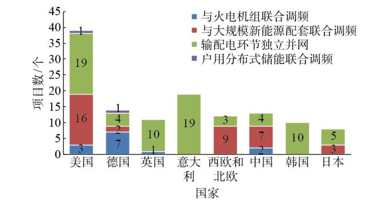 部分國家和地區(qū)在上述4種運行模式下兆瓦級儲能調(diào)頻項目分布如圖 3所示。資料中未指出并網(wǎng)環(huán)節(jié)的項目未計入其中。