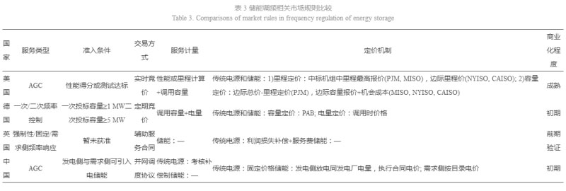 各國儲能參與調(diào)頻市場的服務類型、準入條件、交易方式、服務計量和定價機制等總結(jié)如表 3所示。