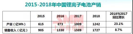 根據(jù)中國(guó)化學(xué)與物理電源行業(yè)協(xié)會(huì)統(tǒng)計(jì)分析,2018年中國(guó)鋰離子電池銷售收入達(dá)到1727億元,比2017年的1589億元,同比增長(zhǎng)8.7%。鋰離子電池的產(chǎn)量由1009億瓦時(shí)增長(zhǎng)到1242億瓦時(shí),同比增長(zhǎng)23.1%。主要是由新能源汽車動(dòng)力電池和儲(chǔ)能電池市場(chǎng)的快速增長(zhǎng)。