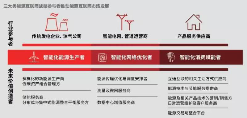 中國能源互聯(lián)網(wǎng)的市場參與者日益多元化。智能化能源生產(chǎn)者、智能化網(wǎng)絡(luò)優(yōu)化者、智能化消費賦能者等三大類能源互聯(lián)網(wǎng)戰(zhàn)略參與者都在加快布局,推動能源互聯(lián)網(wǎng)市場發(fā)展。