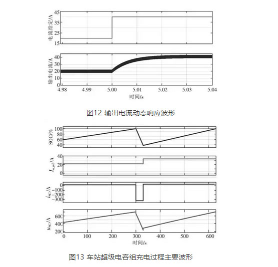 隔離三電平DC/DC 變換器直接為超級電容組充電, 主要通過仿真驗證其輸出電流控制性能以及輸出電流給定的正確性。圖12 為輸出電流動態(tài)響應(yīng)波形, 在5 s 時輸出電流給定由20 A 變?yōu)?0 A, 輸出電流動態(tài)調(diào)整時間為20 ms, 且在動態(tài)調(diào)整過程中無超調(diào)。充電站對充電電流響應(yīng)速度不是很敏感, 可以設(shè)計為無超調(diào)系統(tǒng), 以保證動態(tài)調(diào)整過程中不會出現(xiàn)過電流現(xiàn)象, 從而確保充電站安全。圖13 為2 個充電站超級電容組2 個充電過程的主要波形, 其中SOC 為超級電容組荷電狀態(tài);I o_ref 為根據(jù)式(9)計算的充電電流的給定;i SC 為超級電容輸入輸出電流;u SC 為超級電容組端電壓。0~300 s 為第一個充電過程, 充電初始荷電狀態(tài)為SOCInitial=58.6%, 根據(jù)式(9)計算出充電電流為21.7 A;在300 s 時, 超級電容組SOC 充電至100%。采用350 A 電流對電容組放電30 s, 以此模擬電車充電過程。在330 s 時, 電車充電結(jié)束, 電容組荷電狀態(tài)變?yōu)镾OCInitial=37.5%,根據(jù)式(9)計算出充電電流為32.8 A;在630 s 時,超級電容組SOC 充電至100%。在充電過程中電流連續(xù), 不存在反復(fù)啟停充電設(shè)備的情況。以上仿真實驗說明根據(jù)SOC 計算充電電流的充電策略是正確的。