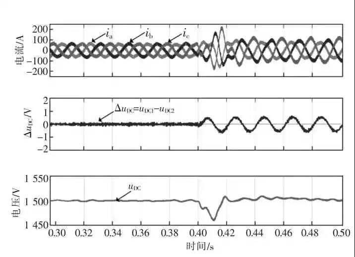 電網(wǎng)電壓變化前后的三相電流波形、 輸出電容電壓差波形以及輸出電壓波形如圖11 所示。輸出電容差在電網(wǎng)電壓對稱情況下被閉環(huán)為0,在電壓不對稱后, 輸出電容差存在低頻波動, 但是波動幅值小于1 V。在電網(wǎng)電壓突然變化后,輸出電壓突降至1 457 V, 在0.02 s 后恢復(fù)至1 500 V。仿真波形說明PWM 整流器控制策略正確, 能夠輸出滿足要求的穩(wěn)定電壓。