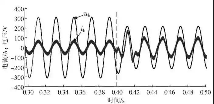 主要驗證PWM 整流器在不平衡電網(wǎng)下, 單位功率因數(shù)整流性能、 輸出電壓二倍頻紋波抑制性能以及輸出電容電壓均衡性能。仿真過程中,負(fù)載為28 kW 時, 在0.4 s 時電網(wǎng)變?yōu)椴黄胶?,電網(wǎng)電壓由三相對稱相電壓有效值220 V 突變?yōu)閡 a=220 V, u b=154 V, u c=88 V。B 相電壓、 電流波形如圖10 所示。電流與電壓同相位, 在0.4 s 時刻,B 相電壓由峰值311 V 突變至峰值218 V。電壓突變后, B 相電流經(jīng)過2 個周期動態(tài)調(diào)整, 重新與B 相電壓同相位。B 相電流峰值電壓跌落前為67 A, 跌落后為83 A。