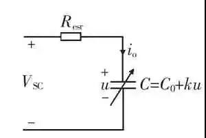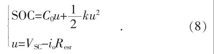 為實現(xiàn)超級電容組連續(xù)電流充電, 需要對超級電容組SOC 進行估計。在功率應(yīng)用中, 超級電容組模型可以采用一階RC 模型等效[10], 如圖9 所示。圖中R esr 為等效串聯(lián)內(nèi)阻,C=C0+ku 隨電容電壓u 變化。根據(jù)圖9 所示模型, 得到超級電容組的SOC 如式(8)所示: