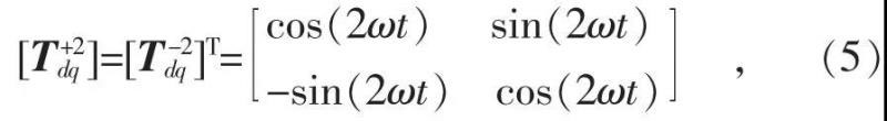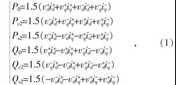 式中: pagenumber_ebook=24,pagenumber_book=21為正序電網(wǎng)電壓的dq 軸分量;pagenumber_ebook=24,pagenumber_book=21為負(fù)序電網(wǎng)電壓的dq 軸 分量;pagenumber_ebook=24,pagenumber_book=21為正序并 網(wǎng)電流的dq 軸分量;pagenumber_ebook=24,pagenumber_book=21為負(fù)序并網(wǎng)電流的dq 軸分量;P0 為有功功率直流分量;P c2 為有功功率二倍頻余弦振蕩分量;P s2 為有功功率二倍頻正弦振蕩分量;Q0 為無功功率直流分量;Q c2 為無功功率二倍頻余弦振蕩分量;Q s2 為無功功率二倍頻正弦振蕩分量。