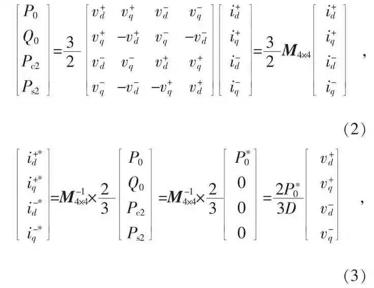 控制器的控制量有pagenumber_ebook=24,pagenumber_book=21共4 個自由度,而功率有P0, P c2, P s2, Q0, Q c2, Q s2 共6 個自由度,只能選其中的4 個功率進行控制。有功P0 必須被控制, 為了避免直流母線產(chǎn)生二倍頻波動, 有功功率二倍頻分量P c2=0, P s2=0。為了實現(xiàn)單位功率因 數(shù) 并 網(wǎng), 無 功 功 率Q0=0。因 此 選 擇P0, P c2,P s2, Q0, 其表達(dá)式如式(2)所示。有功功率直流分量給定由輸出直流電壓閉環(huán)得到, pagenumber_ebook=24,pagenumber_book=21, pagenumber_ebook=24,pagenumber_book=21,pagenumber_ebook=24,pagenumber_book=21, 已知功率給定, 對矩陣M 4×4 求逆, 可以得到dq 軸電流給定表達(dá)式如式(3)所示。