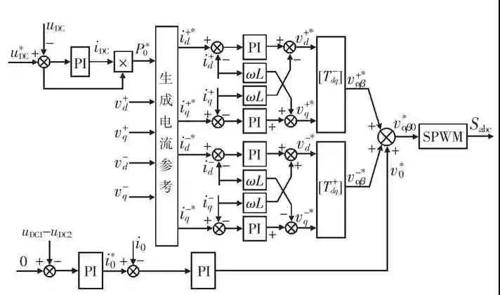 如圖6 所示, 輸出電容電壓差控制環(huán)路獨立于功率控制環(huán), 輸出電容電壓差控制系統(tǒng)的給定為0, 經(jīng)PI 閉環(huán)控制后產(chǎn)生零序電流給定信號,經(jīng)零序電流閉環(huán)后產(chǎn)生零序電壓給定信號。直流母線電壓u DC 經(jīng)PI 調(diào)節(jié)器閉環(huán)后, 產(chǎn)生直流電流給定信號, 再與直流電壓給定信號相乘得到有功功率給定信號。不平衡電網(wǎng)下, 正、 負(fù)序電壓電流產(chǎn)生的功率[6]為: