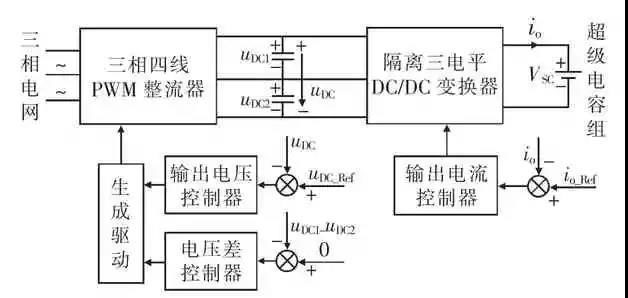 超級電容組充電裝置由PWM 整流器與隔離三電平DC/DC 變換器兩部分組成。為增強對電網(wǎng)的適應(yīng)性, PWM 整流裝置應(yīng)實現(xiàn)不平衡電網(wǎng)下的單位功率因數(shù)整流。先以PWM 輸出的2 路串聯(lián)相等的電壓作為三電平DC/DC 變換器輸入,然后再控制DC/DC 變換器輸出電流為超級電容組充電。充電控制策略總體框圖如圖5 所示,PWM 整流器實現(xiàn)輸出電壓閉環(huán)控制, 輸出電容電壓差均衡控制, 而DC/DC 變換器實現(xiàn)輸出電流閉環(huán)控制。