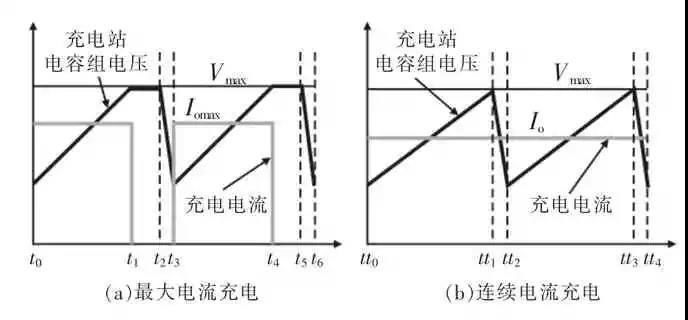 電車每次充電前, 應(yīng)將充電站的超級電容組充至滿電, 以適用于不同的電車負(fù)荷。充電站超級電容組預(yù)充電方式主要分為最大電流充電與連續(xù)電流充電2 種, 如圖4 所示。