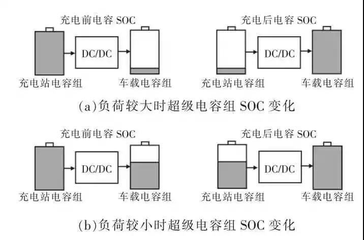 基于超級電容預(yù)儲能的電車充電站運行為:在電車進站前, 為充電站超級電容組預(yù)充電;當(dāng)電車進站后, 將充電站超級電容組能量通過大功率非隔離DC/DC 變換器轉(zhuǎn)移至車載超級電容組,并將車載超級電容組充滿。由于電車在不同負(fù)載下剩余電荷不同, 因此在電車充電后, 充電站超級電容組剩余電荷量不同。圖3 給出了電車充電后超級電容組SOC(荷電狀態(tài))。如圖3(a)所示,電車負(fù)荷較大時, 電車充電前剩余電荷量較小,充電后充電站電容組剩余電荷量較??;如圖3(b)所示, 電車負(fù)荷較小時, 電車充電前剩余電荷量較大, 充電后充電站電容組剩余電荷量較大。