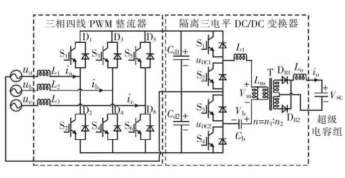 充電站超級電容組充電拓?fù)錇? 級結(jié)構(gòu), 前級為PWM 整流裝置, 實現(xiàn)復(fù)雜電網(wǎng)條件下的單位功率因數(shù)整流, 將交流電變換為直流電;后級隔離三電平DC/DC 變換器為超級電容組充電。采用三相四線制PWM 整流器, 為隔離三電平DC/DC 變換器提供2 路串聯(lián)相等的電壓。隔離三電平DC/DC 變換器能夠有效減小開關(guān)管電壓應(yīng)力, 提高開關(guān)頻率, 且開關(guān)管能夠?qū)崿F(xiàn)零電壓軟開關(guān)[4],進一步提高開關(guān)管頻率。開關(guān)頻率的提高能夠有效減小高頻變壓器體積。