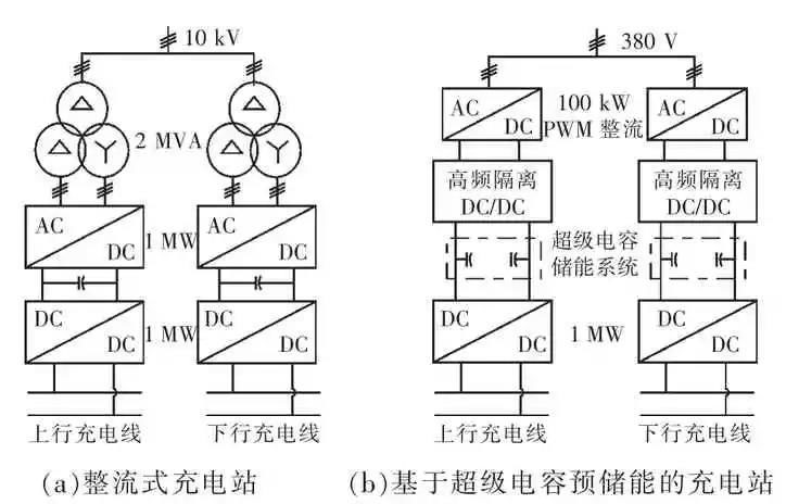 由于超級電容儲能系統(tǒng)能量密度較低, 每隔幾千米或十幾千米需要對基于超級電容儲能的電車充電。為了減少電車停靠時間, 要求充電時間短, 一般為幾十秒, 這就需要充電站具有較大的充電功率。目前工程應(yīng)用的充電站為整流式充電站, 如圖1 (a) 所示。充電站采用10 kV 電網(wǎng)供電, 先經(jīng)過多脈波整流變壓器產(chǎn)生移相電壓, 再進行多脈波整流, 將交流電轉(zhuǎn)換為直流電, 最后通過DC/DC 變換器為超級電容電車充電。該充電站需要10 kV 專用電網(wǎng), 采用兆瓦級工頻變壓器,體積較大, 且充電時對配電網(wǎng)沖擊較大。為解決整流式電站存在的對城市配電網(wǎng)的大負(fù)荷短時沖擊問題, 有研究者提出了基于超級電容預(yù)儲能的電車充電站[2], 如圖1(b)所示。采用380 V 交流電供電, 經(jīng)PWM(脈沖寬度調(diào)制)整流后變?yōu)橹绷麟姡?再采用隔離DC/DC 變換器為充電站超級電容組充電, 充電功率較小。與整流式充電站相比,基于超級電容儲能的充電站對配電網(wǎng)無沖擊, 且不需要10 kV 專用電網(wǎng), 具有功率因數(shù)高、 高頻變壓器體積小等優(yōu)點?;诔夒娙輧δ艿某潆娬拘枰獙Τ潆娬镜某夒娙萁M預(yù)充電, 本文將研究預(yù)充電的充電拓?fù)湟约俺潆姴呗浴?
